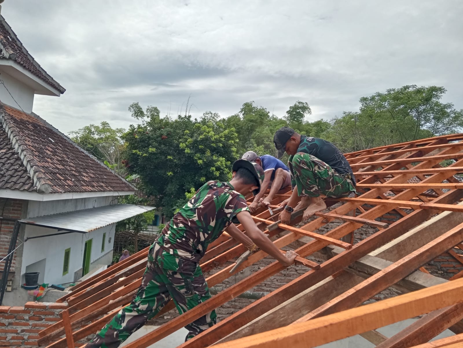 Kegiatan gotong royong tersebut dipimpin langsung oleh Koptu Trihandoko bersama anggota Satgas lainnya. Mereka tampak kompak memasang rangka dan kayu penopang atap, menandai bahwa struktur utama bangunan telah rampung dan kini memasuki tahap penyempurnaan.